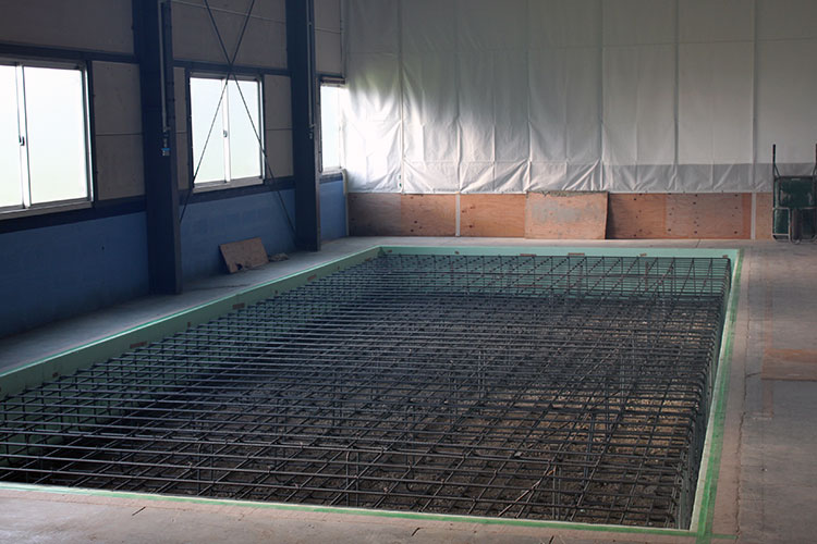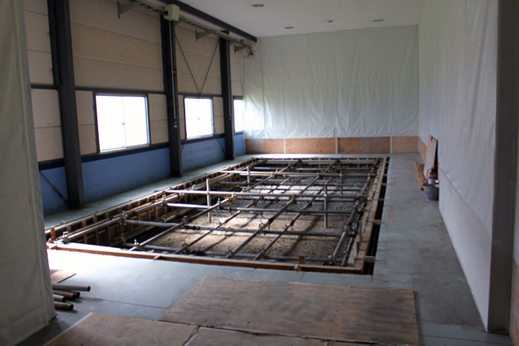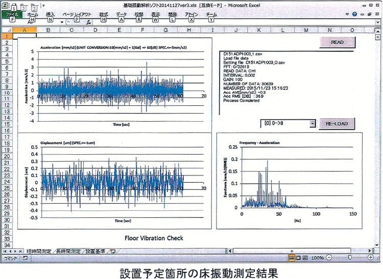 当社は、外乱振動の影響を除去するために基礎工事(5m×10m×0.7m)を行いました。VM52床振動レべル計(リオン製)で床振動測定をした結果、変異振動1μm以内に抑えられ、機上では機械停止時の振動は、サーボ制御により位置偏差は3軸すべて2パルス(1パルス2ナノ)以内の機械状態に保たれています。